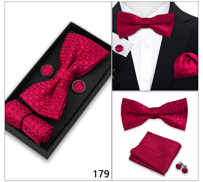- Complete Set – Includes a bow tie (12x6cm), pocket square (23x23cm), and cufflinks (1.5cm)